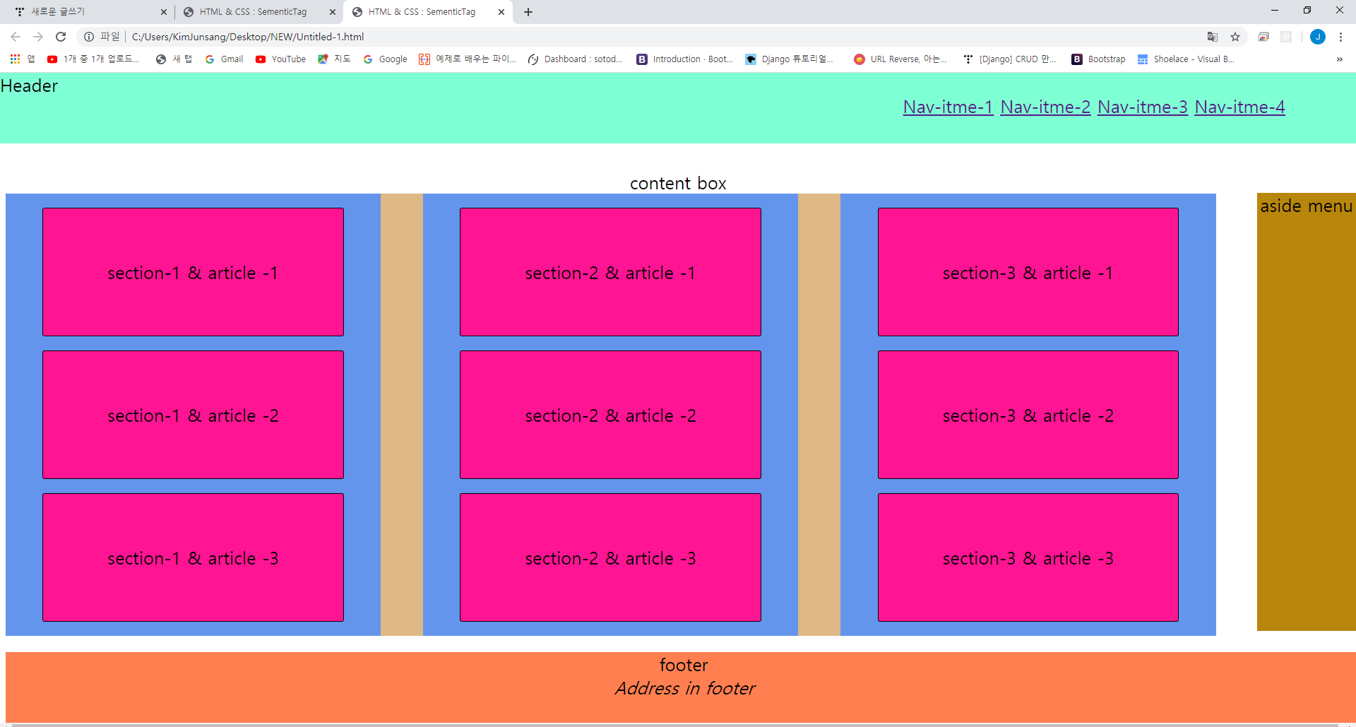 실습 1 . 각 시멘틱 테그 의미 , 위치 연습